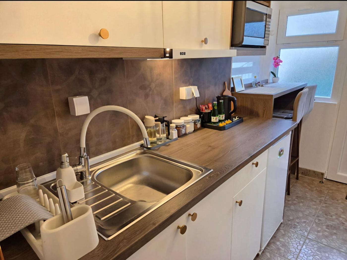 One-Bedroom House. Featuring a private entrance, this air-conditioned holiday home comprises a kitchenette, 1 bedroom and 1 bathroom with a walk-in shower and a hairdryer. Guests can make meals in the kitchenette that comes with a stovetop, a refrigerator, kitchenware and a microwave. Boasting a terrace with garden views, this holiday home also provides a coffee machine and a flat-screen TV with cable channels. The unit offers 1 bed.